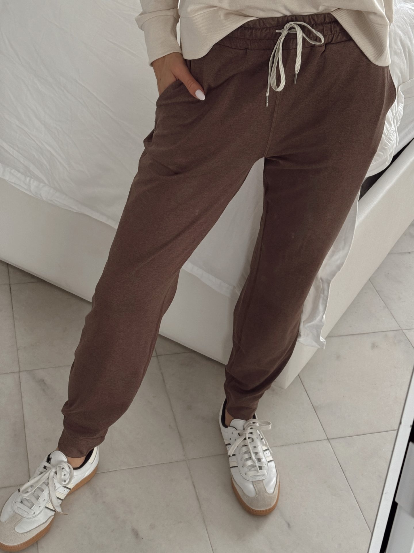 These sweatpants are an absolute must-have for me. They feel like a “fancy” sweatpant and definitely the warmest of all the joggers. They also are fleece lined on the inside which is great for the cooler months. These joggers have a drawstring in the waistband as well which allows me to control how tight they are. I’m wearing a size small.