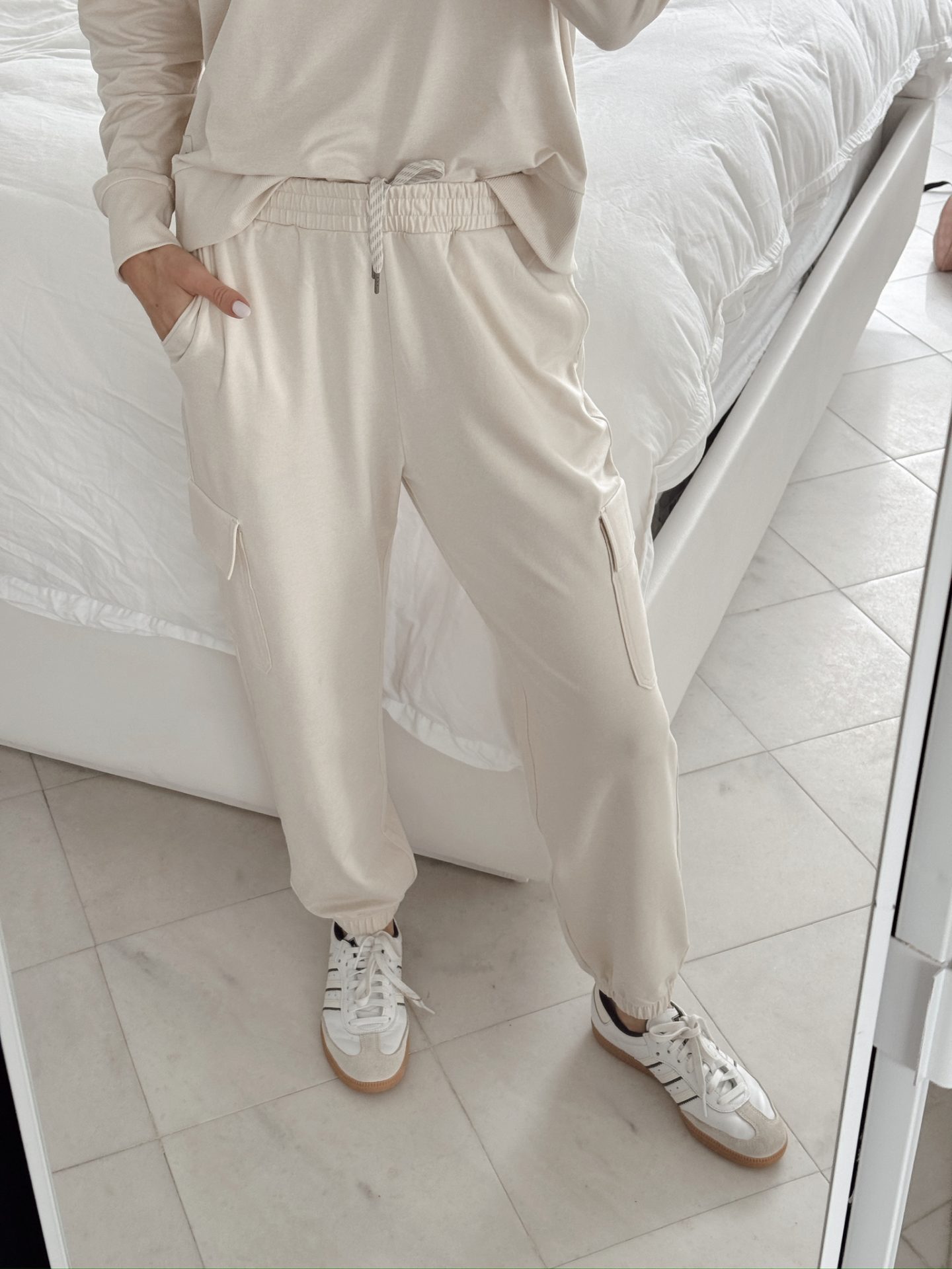 These cargo-styled joggers are a bit baggier than the others for a more relaxed fit. The fabric is super soft and light which makes these breathable. The length is longer than the others and hits at the end of the ankle. I’m wearing a size small.