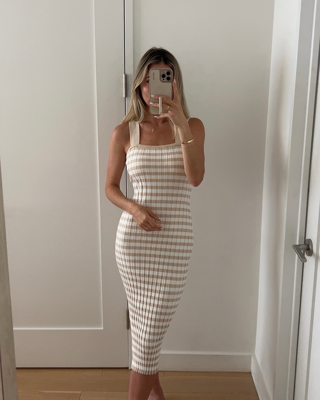 - This striped knit dress (above) is the perfect length and has a flattering fit that holds you in.