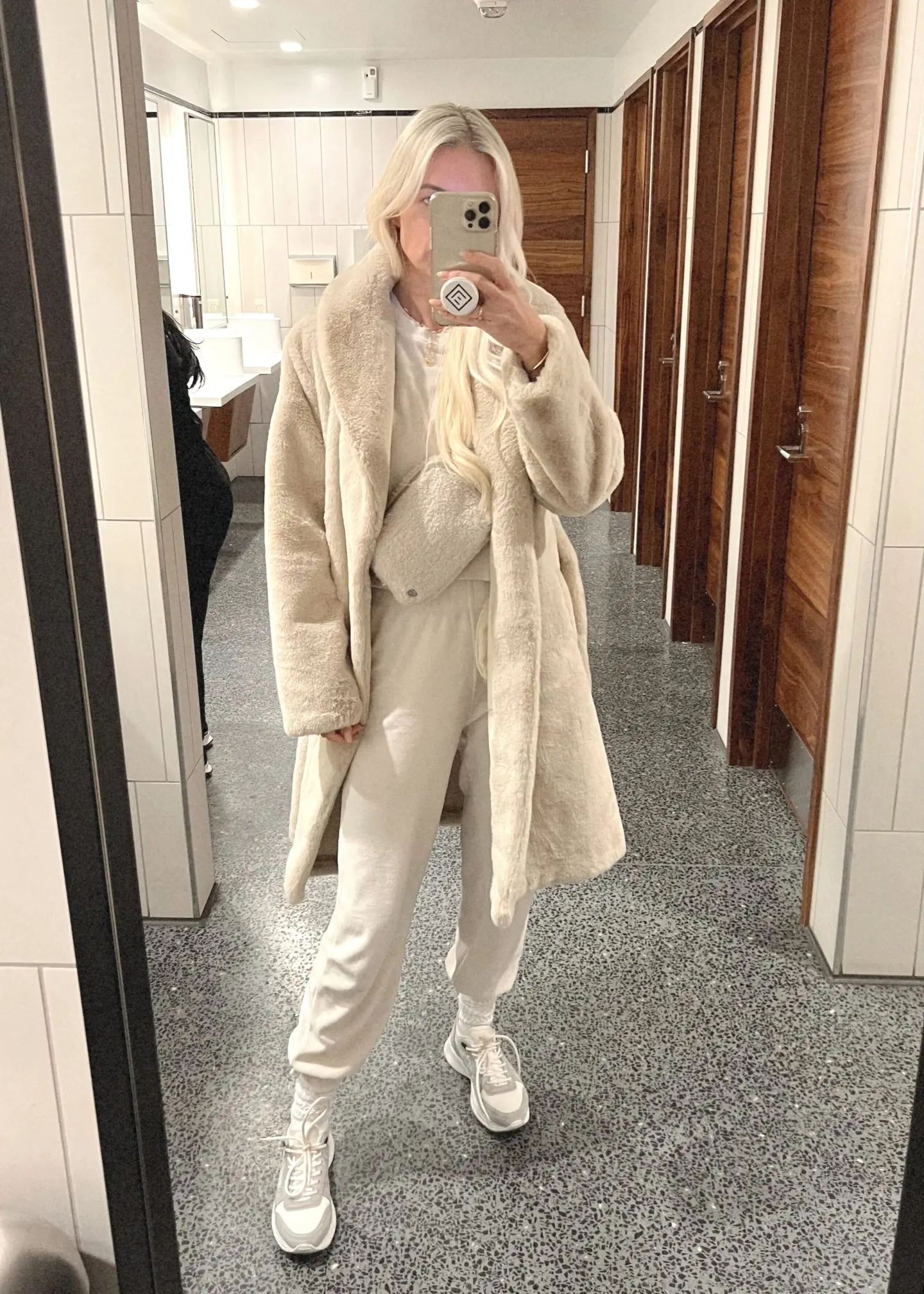 Sweatpants | Sneakers | Faux Fur Coat | Belt Bag
